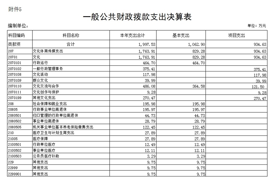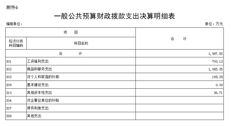 2016年公共财政拨款支出1997.53万元,比2015年决算1913.50数增加84.04 万元,增长4.39%,具体情况如下(按项级科目分类统计):
