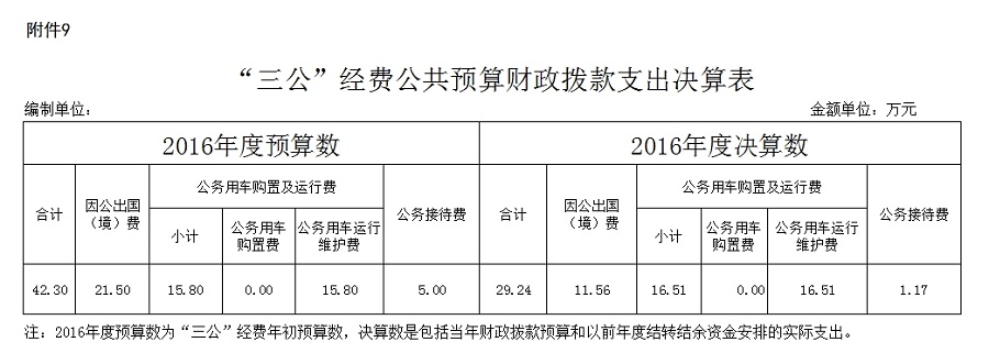 2016年“三公”经费公共财政拨款预算42.30万元,支出决算29.24万元,完成预算的69.13%,同比增长19.56%。主要原因是出国经费和公务用车运行费增加幅度较大。具体情况如下: