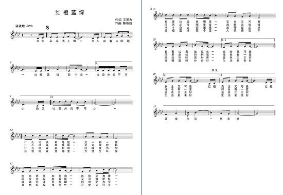 市音协会员、中央音乐学院鼓浪屿钢琴学校教师王昱力作词,陈姝婧编曲,创作垃圾分类原创歌曲《红橙蓝绿》。两位老师经过查阅大量资料及数次修改,将歌曲通过朗朗上口的对话问答形式,讲述了垃圾分类的重要性及分类要求。