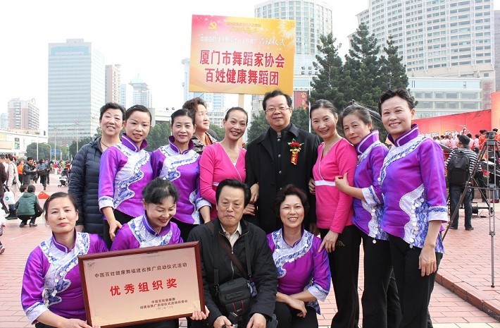 12月9日,由中共福建省委宣传部、中国舞蹈家协会、中共福建省委精神文明建设办公室、福建省文学艺术界联合会共同举办的“舞动八闽、喜迎党的十八大——中国‘百姓健康舞’福建全民推广启动仪式”在福州举行,厦门市舞蹈家协会组织50人的厦门代表队赴榕参加启动仪式活动。在全省12个团队、近千人的激烈比拼中,厦门代表队“百姓健康舞蹈团”以优异的表现脱颖而出,获得组委会颁发的中国百姓健康舞福建省推广启动仪式活动优秀组织奖。今年7月份,根据市文联的安排,厦门市舞蹈家协会就开始积极准备参与该项活动,选派舞蹈教师赴榕参加中国“百姓健康舞”首期福建省骨干教师培训班学习,并及时在厦门全面推广普及。为把活动做得更到位,更有厦门特色,市舞协还邀请北京舞蹈界专家来厦指导,近400名舞蹈爱好者参加了培训,有效地推动了百姓健康舞活动的开展和普及。(厦门市舞蹈家协会)