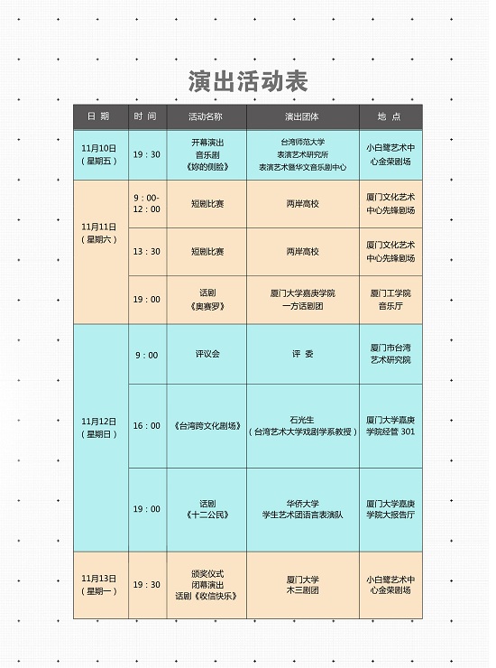 此次戏剧节将开展大戏展演、短剧比赛、戏剧讲座等多项活动。台湾师范大学表演艺术研究所和表演艺术暨华文音乐剧中心将带来表现台湾大学生生活的新创音乐剧《你的侧脸》,厦门大学中文有戏演出季出品、木三剧团演出的《收信快乐》,华侨大学学生艺术团语言表演队演出的《十二公民》,厦门大学嘉庚学院一方话剧团演出的《奥赛罗》等,入选大戏展演。据悉,为了此次演出,今年暑假期间,市戏剧家协会为厦门多所高校话剧社团的学生安排了戏剧小品培训。