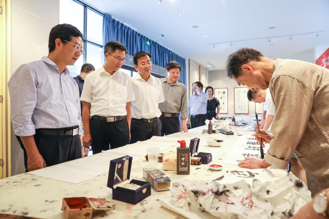 陈秋雄仔细欣赏每一幅书法作品,并不时与艺术家和支部党员交流,还观赏了参加现场笔会的书法家的创作。他充分肯定市文联发挥职能作用,以丰富多彩的文艺形式宣传好党的十九大精神。他说,中华优秀传统文化是中华民族的精神命脉,我们通过书法、诗词、楹联这些优秀传统文艺作品开展学习宣传活动,能够发挥文艺对人民精神的引领作用和对人民心灵的陶冶作用。他希望我市艺术家自觉担当起时代赋予的责任和使命,用艺术的形式深入宣传习近平新时代中国特色社会主义思想,用手中的笔墨歌颂伟大的祖国、伟大的党,创作出无愧于新时代的文艺精品。