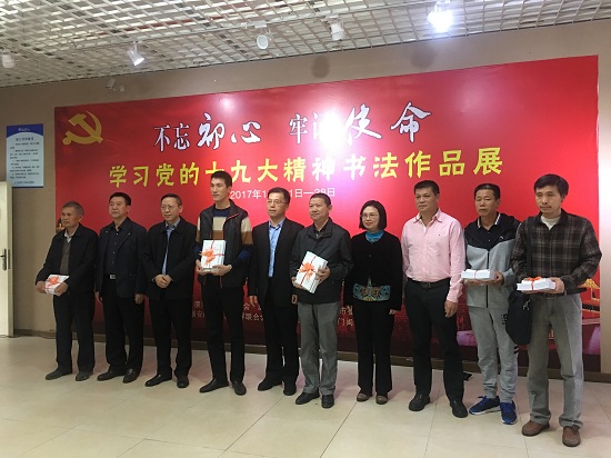 开幕式当天,市文联领导及翔安区领导向翔安书法家代表们现场赠送了《党的十九大精神》读本,书法家们现场挥毫泼墨,共同分享十九大报告学习心得。