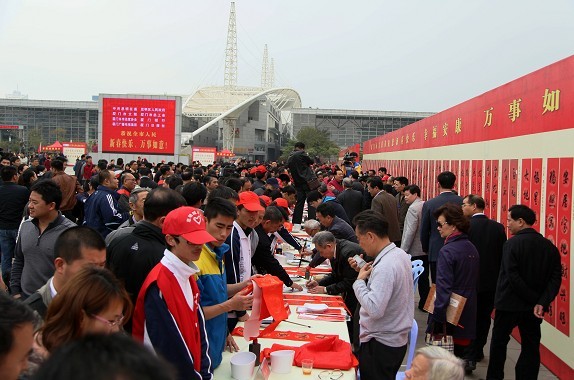 100位市劳模身带大红花到现场接受书法家赠送的春联书法作品,同时拿着领到的春联纸请书法家书写春联,100位城市义工、100位环卫工人身着各自的统一制服穿梭在现场,特别引人注目,150名志愿者忙忙碌碌地为书法家、市民服务,其乐融融。许多市民携儿带女,除了求取墨宝外,也让孩子现场观摩,感受中华文化的博大精深。在现场除了100位书法家,主办单位特地留出“市民互动区位”,让书法爱好者参与书写春联,吸引了不少市民的热情参与。活动持续到天黑,很多书法家桌前还排满了求取墨宝的市民,在场的几位老书家表示,虽然很辛苦,但很开心、很高兴能为市民增添一点春节的文化气息,献上一份新年的祝福。台湾书法家说,第一次参加这么大型、壮观的“两岸百名书法家同台挥春”活动,现场气氛如此活跃喜庆,让他们感到很感动、很激动。