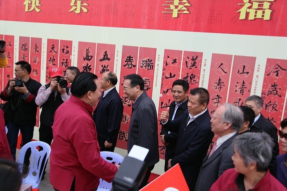 为落实党的十八大精神,丰富市民文化生活,增添春节文化气氛,促进两岸文化交流,由厦门市委宣传部、市文联、中共思明区委、思明区人民政府、市总工会、厦门日报社、厦门广电集团、市书协、厦门银行联合主办、厦门闽台书画院、厦门闽台美术馆、厦门市文化宫等单位承办的“百福贺岁两岸同春——海峡两岸百名书家大型春联笔会”于2013年2月3日下午在厦门市五一文化广场隆重举办。市委副书记、市长刘可清,市委常委、市政法委书记詹沧洲,市政协副主席潘世建,金门县议长王再生,思明区委书记游文昌,思明区区长黄乔生,市台办主任吴明哲,市机关事务管理局书记、局长郭星达,市委宣传部副部长、广电集团董事长徐国庆,市委宣传部副部长林朝晖,市文联党组书记张萍,市文联副主席林汝勋,市总工会党组书记、副主席陈永红,厦门日报社副总编江曙耀,厦门银行副行长戴文进,思明区副区长林旭阳等领导嘉宾出席活动的开幕式。