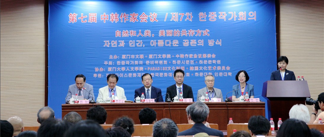 5月26日上午,由厦门市文联、厦门文学院、中韩作家会议筹委会主办;厦门大学人文学院、PARADISE文化财团、韩国文化艺术委员会协办的第七届中韩作家会议在厦门大学克立楼举行开幕式。来自中韩两国50多位知名诗人、小说家、文艺评论家——阿来、赵玫、范小青、于坚、吴克敬、朵渔,黄东奎、金柱演、金周荣、郑玄宗等出席开幕式。著名诗人舒婷和韩国仁荷大学韩国语言文学系教授、著名评论家洪延善分别介绍了中韩双方的与会人员。他们别开生面和诙谐幽默的介绍方式,赢得阵阵掌声。