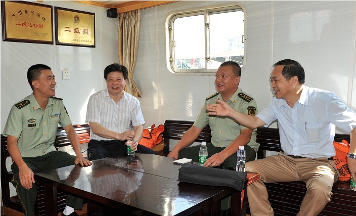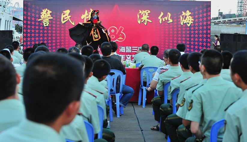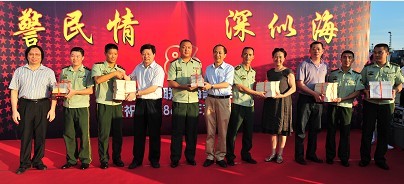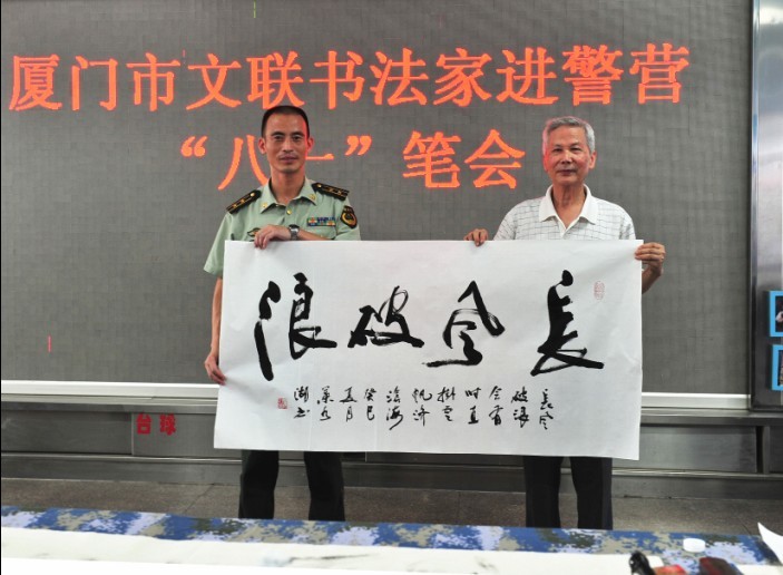 “谁控制了海洋谁就控制了整个世界。”我国历史也证明:向海必兴,背海必衰。7月23日,正当中国海警局正式挂牌的第二天,怀着“建设海洋强国、实现中国梦”的无限憧憬和对我国海疆卫士的崇敬心情,市文联党组书记、常务副主席林起带领40多位文艺家亲赴省海警三支队海沧驻地,踏上了军舰,走进了营房,举办笔会、赠送书籍和文艺演出,为这些守护祖国海疆的官兵们送来了“精神食粮”,并与他们进行“心连心”的沟通。市知名书法家叶水湖、谢荣仁、林锻练、李世平、朱金镑等为官兵们留下20余幅墨宝,勉励他们“乘风破浪、再建奇功”!解析该支队政委任立明的姓名意涵,赠予“明心立志任风云”以共勉。许多官兵得到了自己梦寐以求的名家书法真迹,激动心情难于言表。