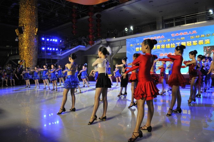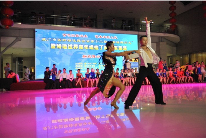 由厦门市文联、厦门市文广新局主办,厦门市国际标准舞协会策划承办的第十二期“国标舞沙龙”•快乐暑期联欢舞会暨特邀拉丁舞青年组世界冠军表演活动于7月27日在市文化艺术中心圆满落幕!联欢活动吸引了我市国标舞、社交舞爱好者五百多人的积极响应。活动中既有来宾参与的群众舞会,也有国标舞协会少儿拉丁舞艺术团献上的精彩表演,特别是拉丁舞青年组世界冠军吴柳福、杜玉君 所带来的恰恰、伦巴、桑巴、斗牛舞、牛仔舞等拉丁舞各舞种极富感染力的激情演绎,更博得了全场观众的热烈掌声,将晚会气氛一次次推向高潮!本次活动有包括市级老领导庄亨浩、市文联书记林起、市文化馆馆长陈颖等领导出席并讲话。