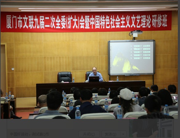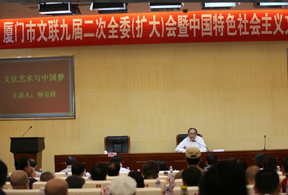 10月31号至11月1号,市文联九届二次全委(扩大)暨中国特色社会主义文艺理论研修班,在厦门市委党校举行。中国文联原副主席仲呈祥和厦门市规划局赵燕菁局长,应邀分别作了《文化艺术与中国梦》和《“美丽厦门”战略规划》的辅导报告。市文联所属各协会、各单位以及相关代表100余人与会。