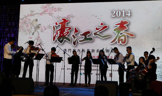 随着澳门青年交响乐团演奏《生日快乐变奏曲》的声音响起,“2014濠江之春——澳门与内地艺术家大联欢”活动拉开序幕。今年的活动侧重在音乐主题。四十多位内地知名艺术家与澳门艺术家共同呈现了一场精彩纷呈的音乐晚会。当晚安排弦乐合奏、女声独唱、男声独唱、古筝独奏、唢呐独奏、钢琴独奏等精彩音乐节目。前来出席“濠江之春”活动的全国政协副主席马培华表示,希望“濠江之春”活动不断促进两地文化交流:“‘濠江之春’活动至今已经举办四届,成为两地文化交流、繁荣澳门文化艺术的一个重要品牌,为澳门文化产业发展积累了宝贵经验。希望积极推进澳门与内地及海外艺术家的交流合作,携手澳门的艺术家,一同推进中华文化的大繁荣大发展。”