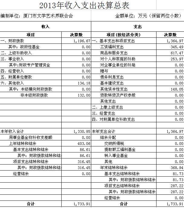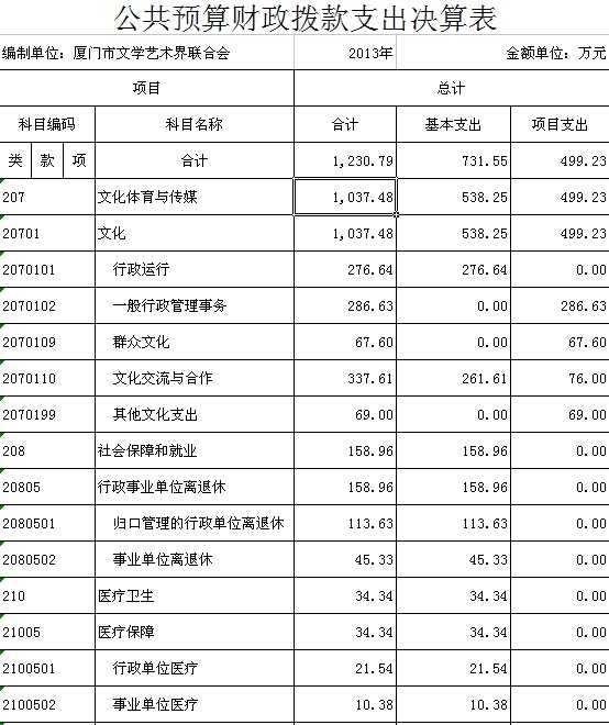 厦门市文联2013年部门决算说明