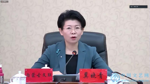 9月28日,全国文联系统新文艺群体职称评审工作推进会在京举行。图为内蒙古自治区文联党组书记、主席冀晓青通过“文艺云·在线视频会议培训系统”做经验交流。