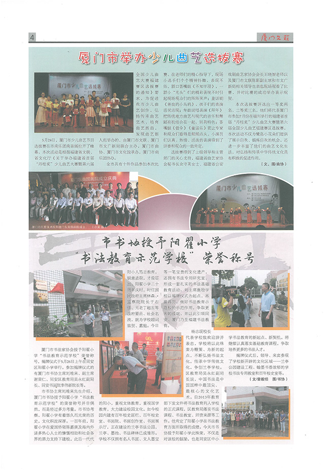 厦门市书法家协会授予阳翟小学“书法教育示范学校”荣誉称号,揭牌仪式于5月26日上午在同安区阳翟小学举行。参加揭牌仪式的有厦门市书协主席刘堆来、副主席谢荣仁、同安区教育局吴永红副局长、同安书画院李伟新院长等。
