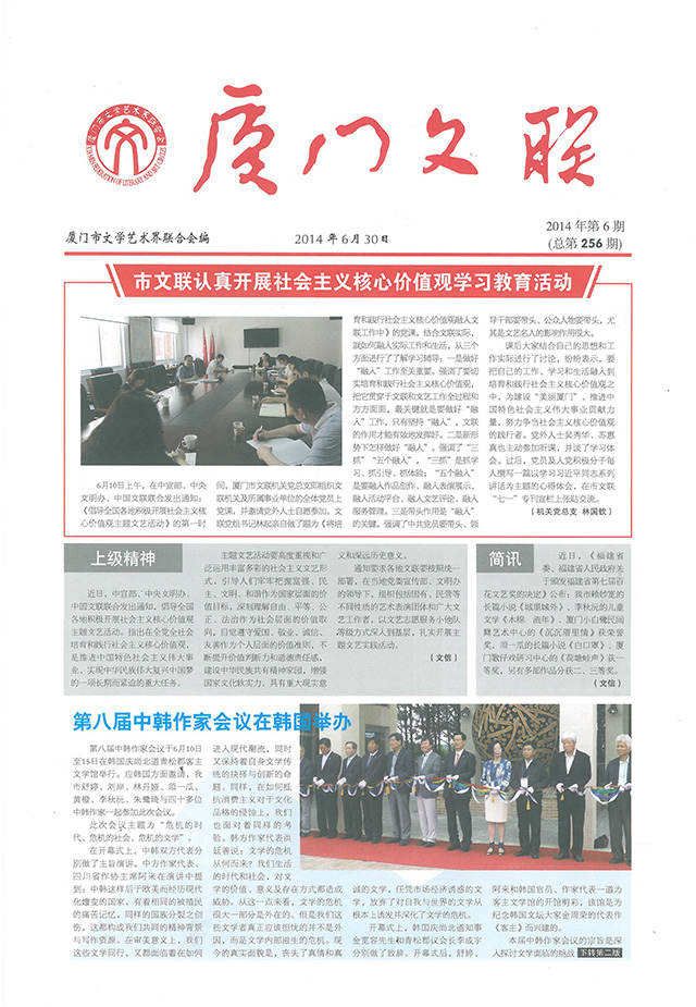 6月10日上午,在中宣部、中央文明办、中国文联联合发出通知:《倡导全国各地积极开展社会主义核心价值观主题文艺活动》的第一时间,厦门市文联机关党总支即组织文联机关及所属事业单位的全体党员上党课,并邀请党外人士自愿参加。文联党组书记林起亲自做了题为《将培育和践行社会主义核心价值观融入文联工作中》的党课,结合文联实际,就如何融入实际工作和生活,强调了三点意见:一是做好“融入”工作至关重要。强调了要切实培育和践行社会主义核心价值观,把它贯穿于文联和文艺工作全过程和方方面面,最关键就是要做好“融入”工作,只有坚持“融入”,文联的作用才能有效地发挥好。二是新形势下怎样做好“融入”。强调了“三抓”“五个融入”,“三抓”是抓学习、抓引导、抓体验;“五个融入”是要融入作品创作、融入表演展示、融入活动平台、融入文艺评论、融入服务管理。三是带头作用是“融入”的关键。强调了中共党员要带头、领导干部要带头、公众人物要带头,尤其是文艺名人的影响作用很大。