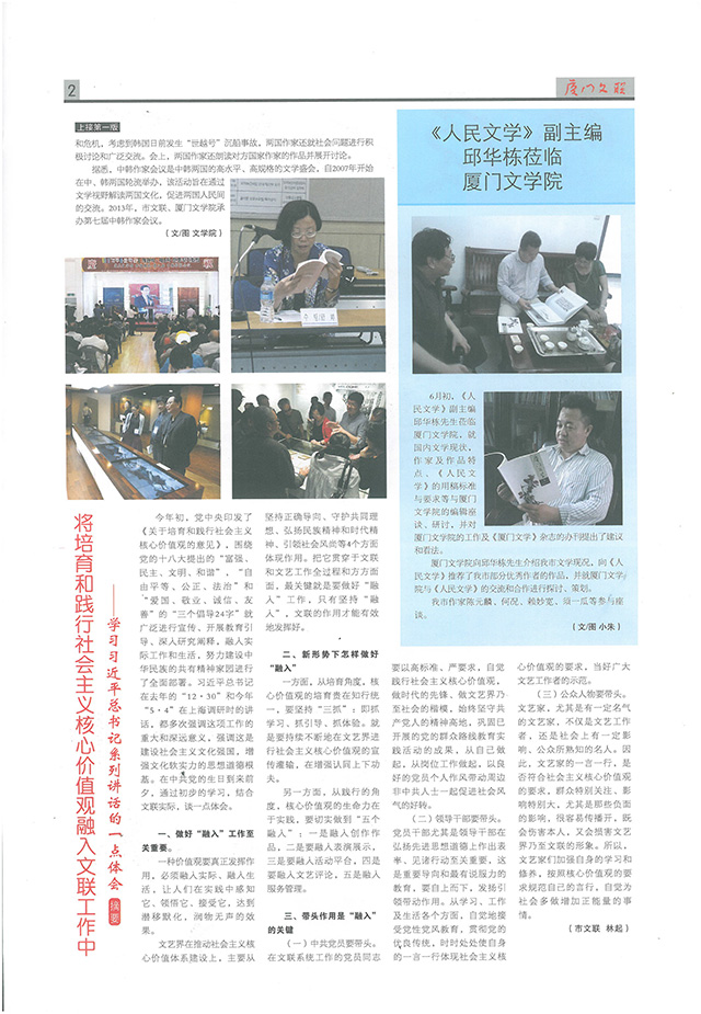6月初,《人民文学》副主编邱华栋先生莅临厦门文学院,就国内文学现状,作家及作品特点、《人民文学》的用稿标准与要求等与厦门文学院的编辑座谈、研讨,并对厦门文学院的工作及《厦门文学》杂志的办刊提出了建议和看法。