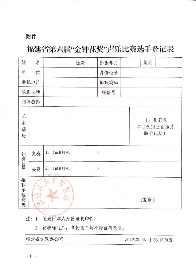 附件:福建省第六届“金钟花奖”声乐比赛选手登记表