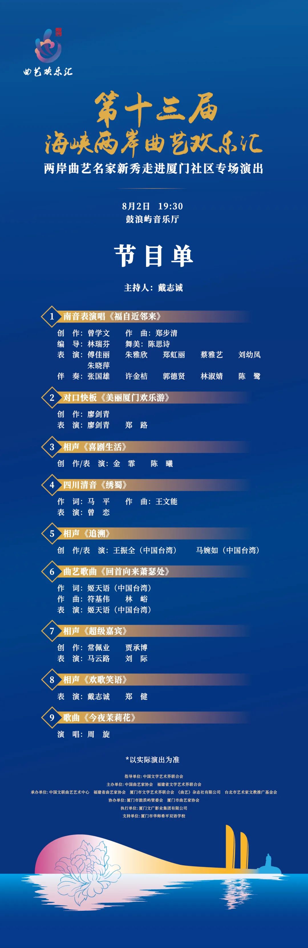 两岸曲韵长,鹭岛再相“汇”。8月1日,由中国文学艺术界联合会指导,中国曲艺家协会、福建省文学艺术界联合会主办,中国文联曲艺艺术中心、福建省曲艺家协会、鸿发国际、《曲艺》杂志社、台北市艺术家文教推广基金会承办的第十三届海峡两岸曲艺欢乐汇在福建厦门拉开序幕。