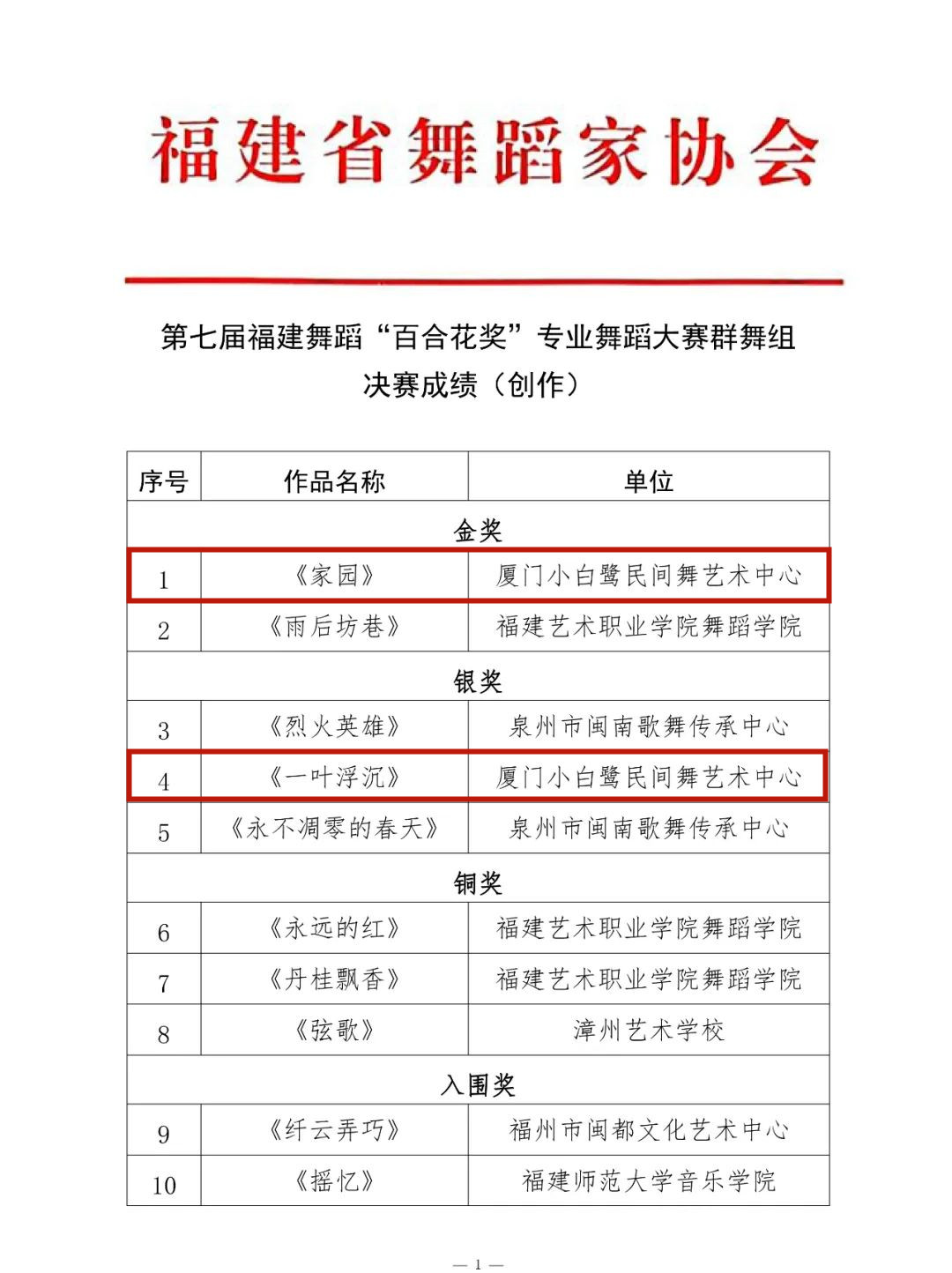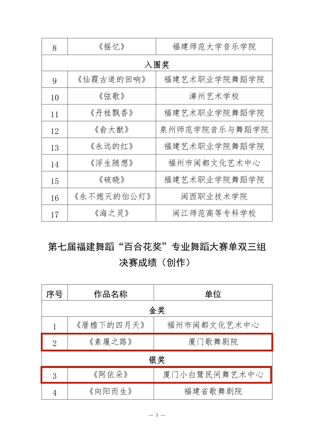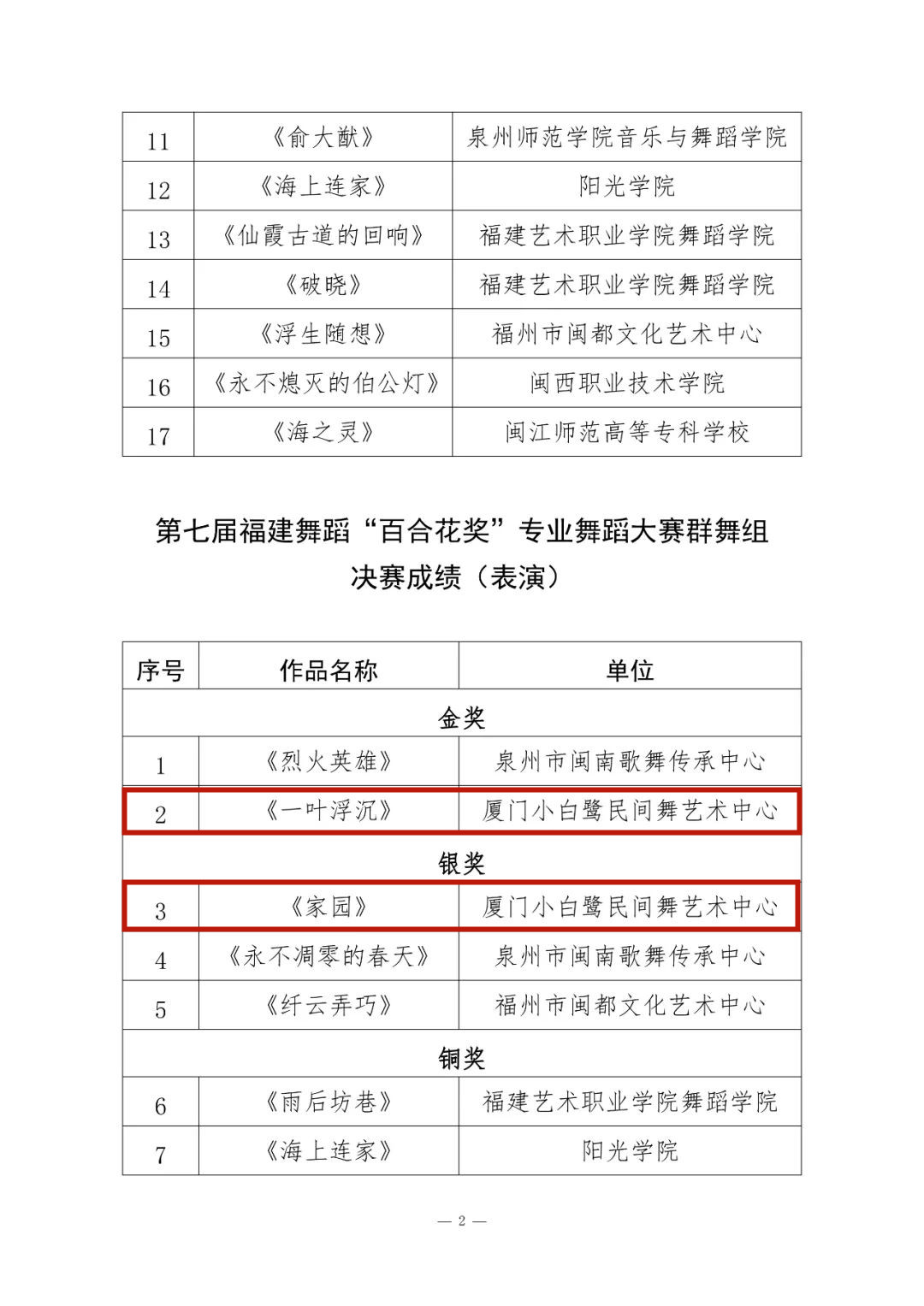 由福建省文联、福建省文化和旅游厅主办,福建省舞蹈家协会承办的艺心永向党 舞颂新时代一一第七届福建舞蹈“百合花奖”专业舞蹈大赛,于近日落下帷幕。经大赛组委会组织现场评审并公示后,由厦门市舞蹈家协会选送的11件舞蹈作品(其中群舞作品2件,单双三人舞作品9件)揽获4金6银3铜及9个入围奖,此外还有3件作品分别获评音乐创作奖、灯光设计奖、服装设计奖,厦门市舞蹈家协会、厦门小白鹭民间舞艺术中心、厦门歌舞剧院、集美大学诚毅学院获评优秀组织奖。