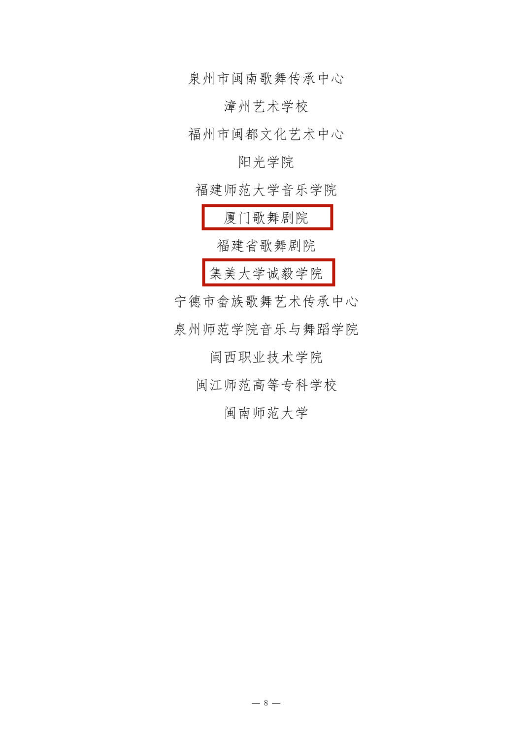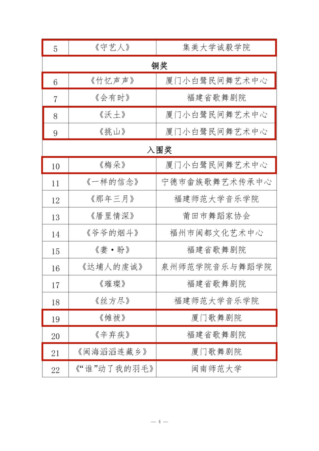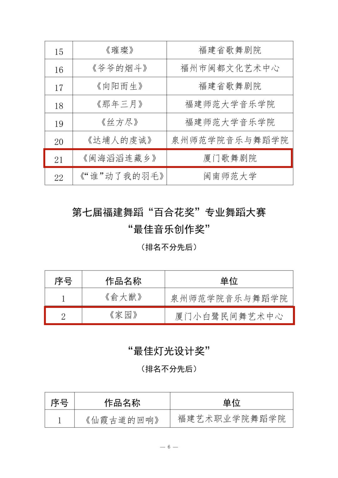 由福建省文联、福建省文化和旅游厅主办,福建省舞蹈家协会承办的艺心永向党 舞颂新时代一一第七届福建舞蹈“百合花奖”专业舞蹈大赛,于近日落下帷幕。经大赛组委会组织现场评审并公示后,由厦门市舞蹈家协会选送的11件舞蹈作品(其中群舞作品2件,单双三人舞作品9件)揽获4金6银3铜及9个入围奖,此外还有3件作品分别获评音乐创作奖、灯光设计奖、服装设计奖,厦门市舞蹈家协会、厦门小白鹭民间舞艺术中心、厦门歌舞剧院、集美大学诚毅学院获评优秀组织奖。