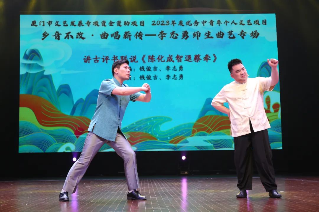 近日,厦门市文艺发展专项资金资助项目2023年度优秀中青年个人文艺项目乡音不改·曲唱薪传——李志勇师生曲艺专场在思明区群众文化艺术活动中心举行。活动旨在弘扬中华优秀传统文化,推动非物质文化遗产项目讲古以及答嘴鼓艺术的传承与保护。“你是厦门娃,我是金门娃,咱俩聚一起就是厦金baby!”由李志勇创编,朱敏瑞、洪靖恩表演的答嘴鼓《厦金童乐》为首个厦金联合创作、联合表演的答嘴鼓剧目,该节目以孩童的口吻讲述了两岸同根同源的文脉传承。此外,曾荣获全国曲艺邀请大赛双十佳节目、首个海峡两岸联合创编的讲古剧目《祝寿风波》,在演出中与现代沙画艺术结合,实现传统曲艺艺术与当代艺术相结合,展现讲古艺术在新时代的创新与发展。