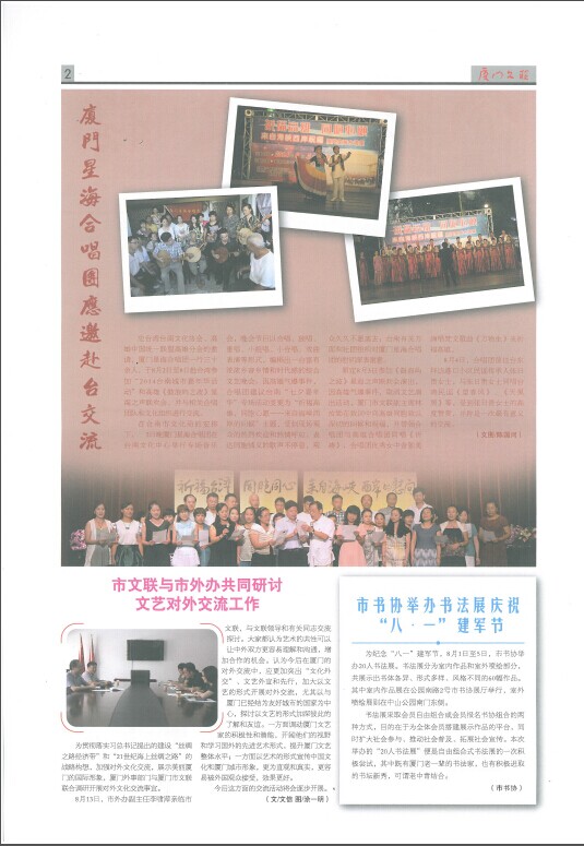 应台湾台南文化协会、高雄中国统一联盟高雄分会的邀请,厦门星海合唱团一行三十余人,于8月2日至8日赴台湾参加“2014台南城市嘉年华活动”和高雄《鼓浪屿之波》星海之声联欢会,并与相关合唱团队和文化组织进行交流。