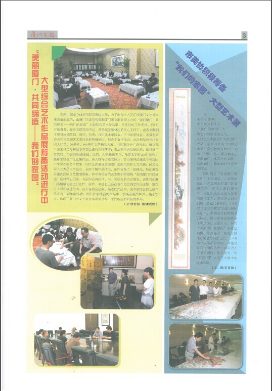 同时建立“美丽厦门胜景图”主创团队,以长卷绘画的形式表现美丽厦门的旖旎风光。在市文联的指导下,主创人员开始投入紧张的创作工作,多次开会讨论画稿,经过几番修改,于8月22日进驻白鹭宾馆进行封闭式创作,期间市文联党组书记林起、副主席林汝勋到创作现场关心主创人员,并对“美丽厦门胜景图”长卷绘画提出修改建议,在充分接受意见进行调整之后,于9月初完成作品的绘画,并邀请厦门市楹联协会主席陈力杰为画卷题诗,作品成为“我们的家园”大型艺术展中的亮丽风景。