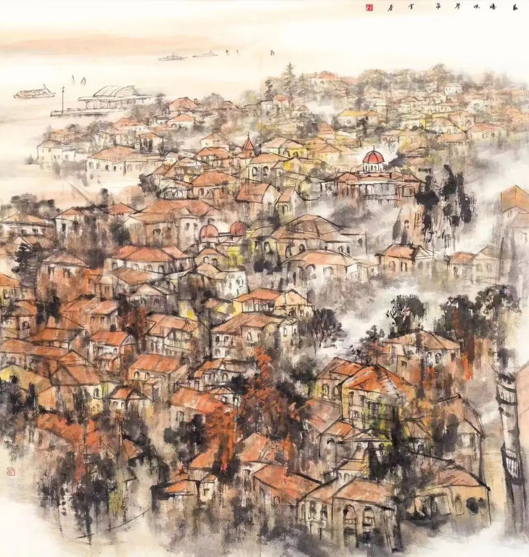 《晨曦映琴岛》以全景式饱滿构图叙述鼓浪屿上最具特色的"红砖红瓦"闽南厝,运用俯视、聚集、留白的手法,渲染晨曦的温润,鼓浪屿街区景色的美丽祥和。画面右边的留白与画面上部聚集的红厝彼此呼应,画面灵动而不滞,与鹭江一衣带水,融汇于海,是一幅娓娓道来海的鼓浪屿。画面虚实相间,松、紧、聚、散点缀有度,笔墨洒脱恣意,墨树与红厝之间形成鲜明对比,美景和真情在作品上交汇,亦诗亦歌,让人眼前一亮。