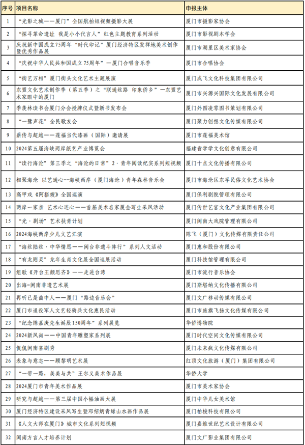 文化艺术活动资助项目32个
