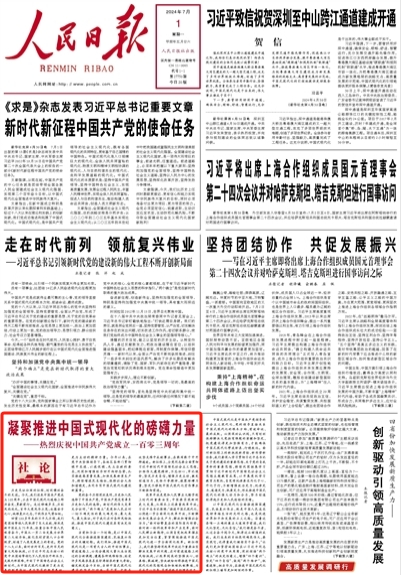 7月1日,《人民日报》第1版刊发社论《凝聚推进中国式现代化的磅礴力量——热烈庆祝中国共产党成立一百零三周年》。