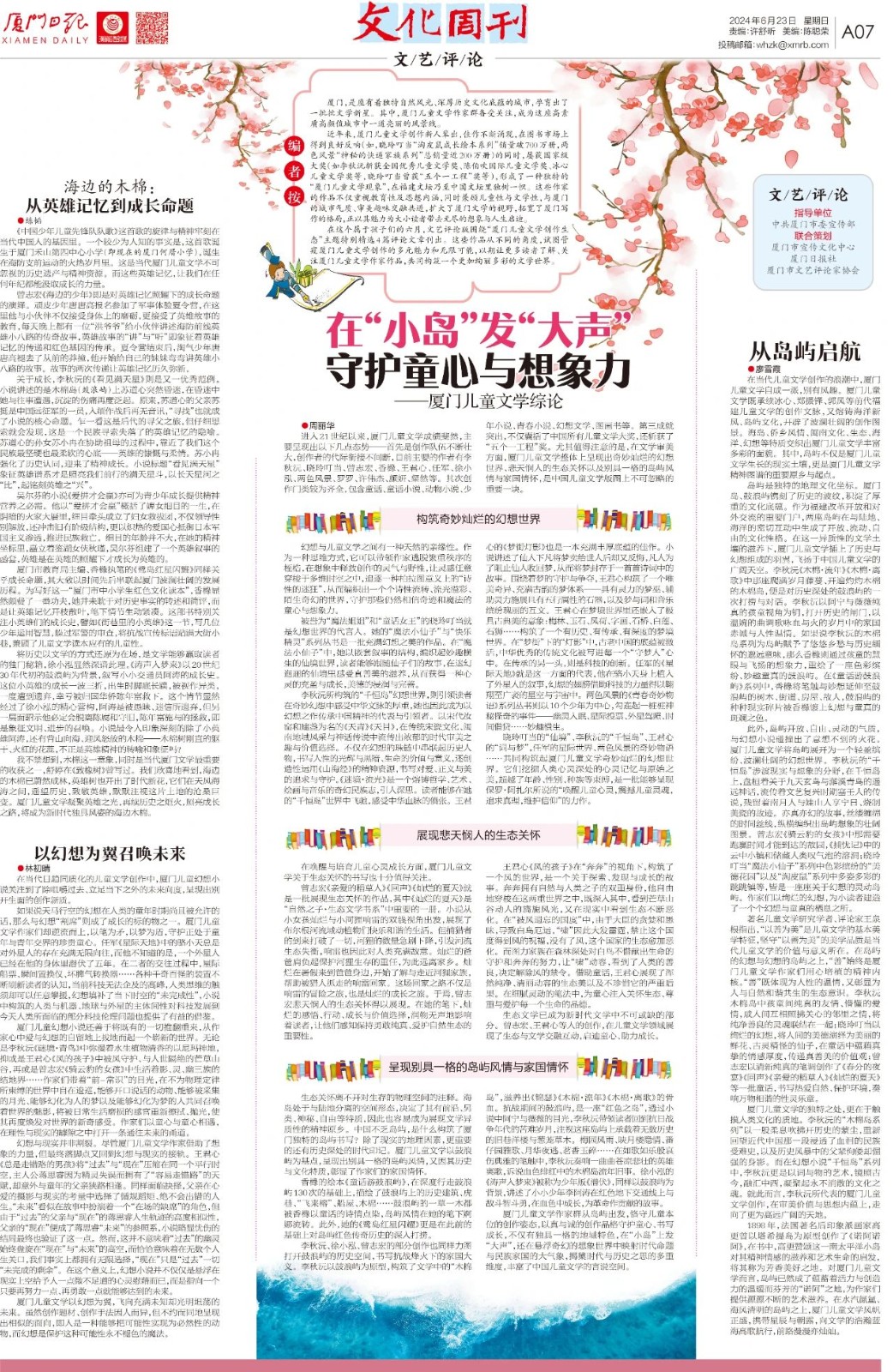 近日,《文艺报》《厦门日报》以专版的形式,对厦门儿童文学作家及作品进行了推介,著名评论家李利芳、崔昕平、聂梦等倾情撰文。这些评论作品从不同的角度,探寻了厦门儿童文学创作的多元魅力和无限可能。希望更多读者了解、关注厦门儿童文学作家作品,共同构筑一个更加绚丽多彩的文学世界。