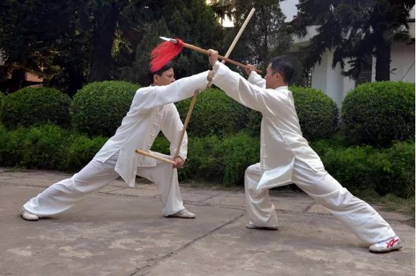 ▲黄峥嵘(左)和杨启伟(右)演练三节棍进枪(厦门市思明区文化馆供图)