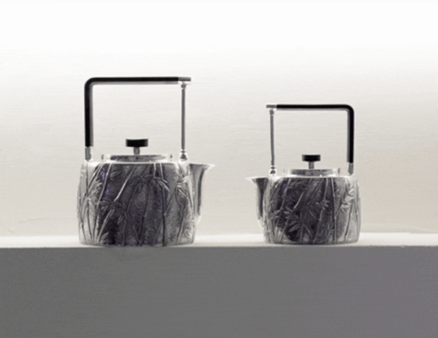 作品灵感来源于中国传统文化赋予竹的人文意涵,竹除了表达节节高升的美好祝愿,更象征着文人的风骨气节。银壶整体使用999银全手工锻造,大壶为煮水银壶,小壶为煮茶银壶。壶身以手工浮雕錾刻出竹林形象,迎风而动的竹姿,跃然器上,表面做氧化颜色处理,增添怀古的人文气息。壶把用黑檀木制作成方提梁款式,与银柱相连,两者展现出刚柔阴阳相调和的意象。壶钮以椭圆的黑檀顶置,画龙点睛出竹的灵魂,提梁回纹装饰柄头,简约且复古,壶身整体的圆润与方提梁,形成圆与方融合的独特视觉效果。