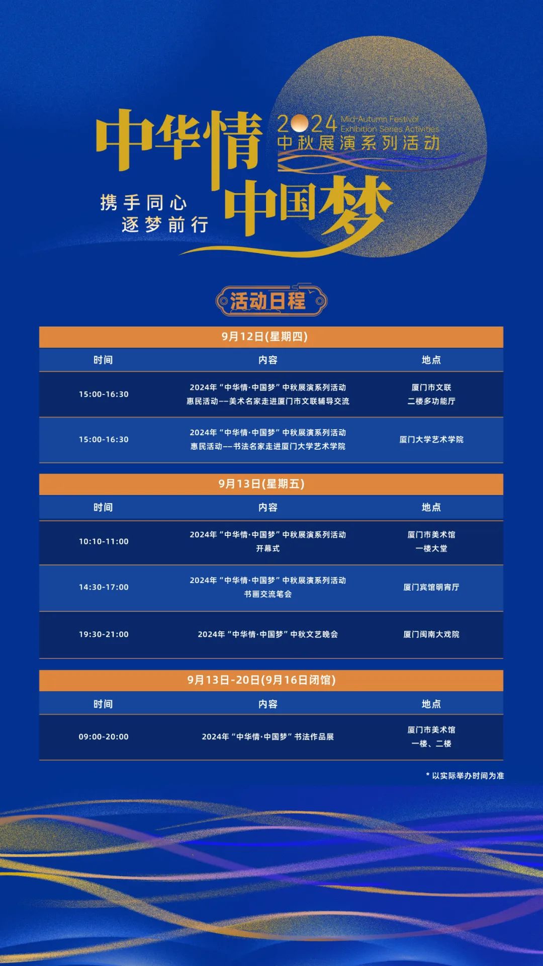 由中国文学艺术界联合会、厦门市人民政府主办,中国文联国内联络部、中国书法家协会、福建省文学艺术界联合会、鸿发国际、厦门市思明区人民政府、厦门广播电视集团承办的2024年“中华情·中国梦”中秋展演系列活动将于9月12日至9月20日在厦门举办,分别在厦门市美术馆、厦门闽南大戏院、厦门市文联、厦门大学等地开展精彩活动。