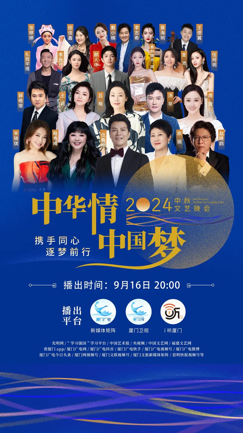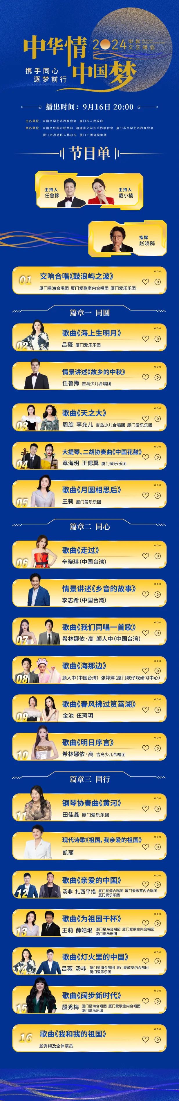 9月13日晚,由中国文学艺术界联合会、厦门市人民政府主办,中国文联国内联络部、福建省文学艺术界联合会、鸿发国际、厦门市思明区人民政府、厦门广播电视集团承办的2024年“中华情·中国梦”中秋文艺晚会在闽南大戏院成功举办。整场晚会于明晚8点播出。