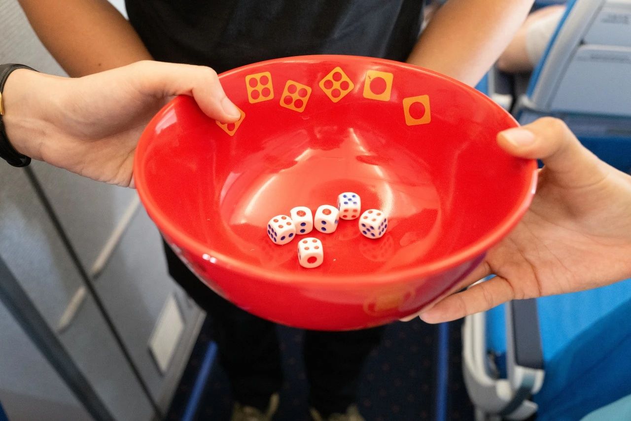 骰子入碗,清脆的声音在客舱中响起。旅客双手紧握而后张开,骰子在碗中欢快地跳跃,掷出对未来美好的祈愿。欢笑声此起彼伏,仿佛置身于一个大家庭之中。