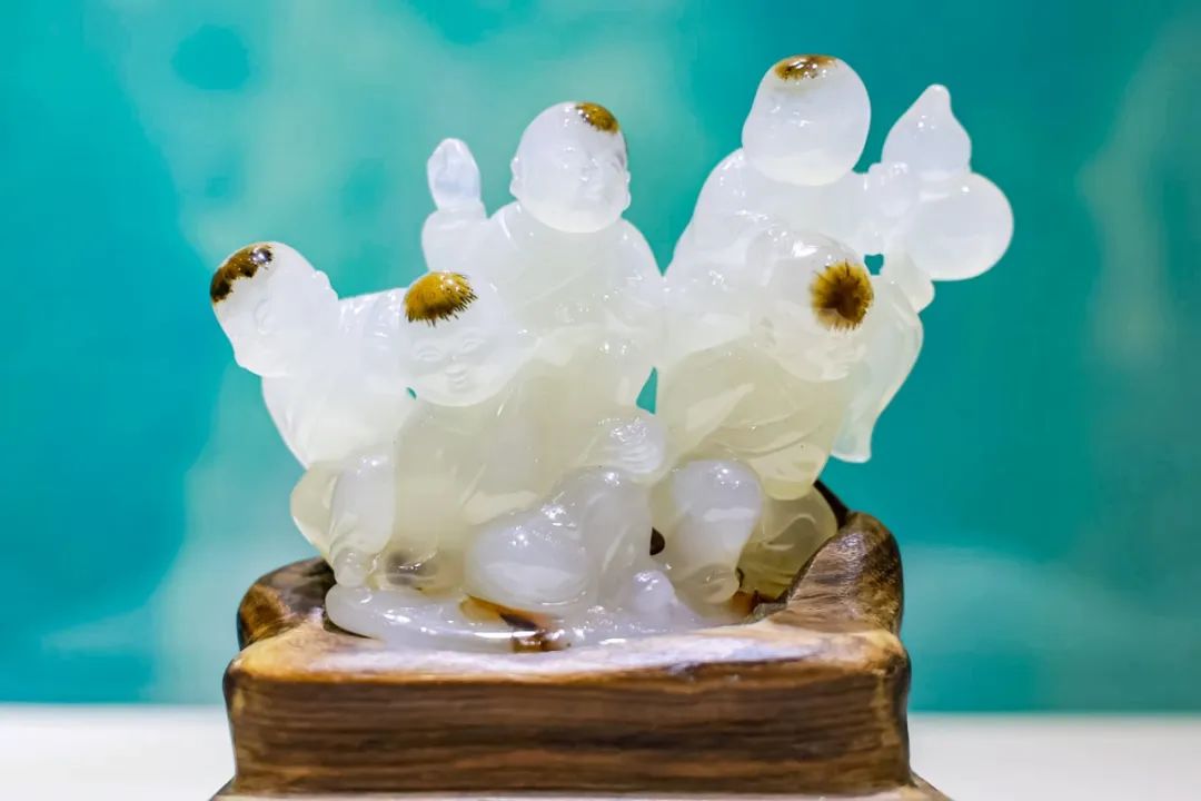 《五子登科》便在古今碰撞和交融中诞生,俏色巧雕工艺,利用玉石的天然色泽和纹理,巧妙地融入到雕刻题材中,使之与作品的主题和氛围相得益彰。作品取材于玉髓,以微透明乳白色为主体,间杂团状针状金红石包体,黄中泛黑,恰与古人所言“黄毛小儿”意象相仿,他巧运灵思,成功地保留了每个童子天然的俏色“头发”,使其显得天真可爱,每个童子的形象都独一无二、栩栩如生。这种对玉石天然色泽的极致利用,充分尊重玉材的自然属性,诠释了“因材施艺”的工艺原则,更展现了其高超的艺术创造力。这种对玉材的尊重和珍视,体现了玉雕艺术的独特魅力和文化内涵,更彰显了中国传统工艺一脉相承的“相物而赋形,范质而施采”的理念。