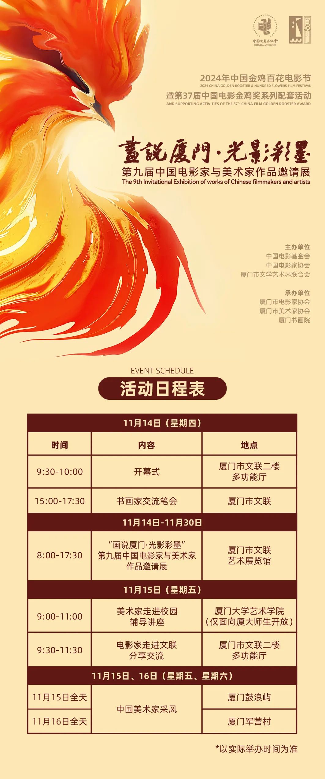 第九届中国电影家与美术家作品邀请展系列活动以“画说厦门·光影彩墨”为主题,包含作品邀请展、书画家交流笔会、惠民活动、采风活动等内容,旨在多维度推进中国电影家与美术家的交流互鉴,促进文艺事业高质量发展,增强民族文化自信。