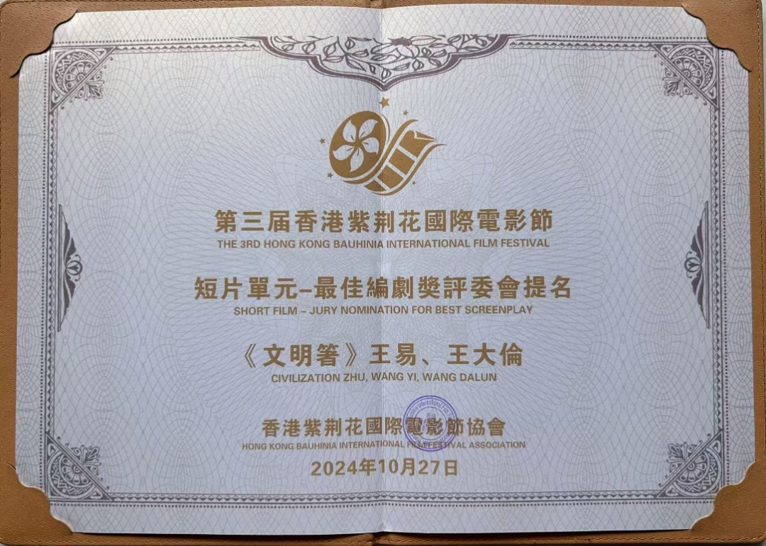 2024年10月27日,第三届香港紫荆花国际电影节在香港盛大落幕,厦门市音乐家协会理事王大伦作曲并演唱的MV音乐短片《文明箸》荣获第三届香港紫荆花国际电影节短片单元最佳编剧奖评委会提名。香港紫荆花国际电影节,是经由香港特别行政区政府相关部门批准,每年举办一届的世界电影主题盛典。
