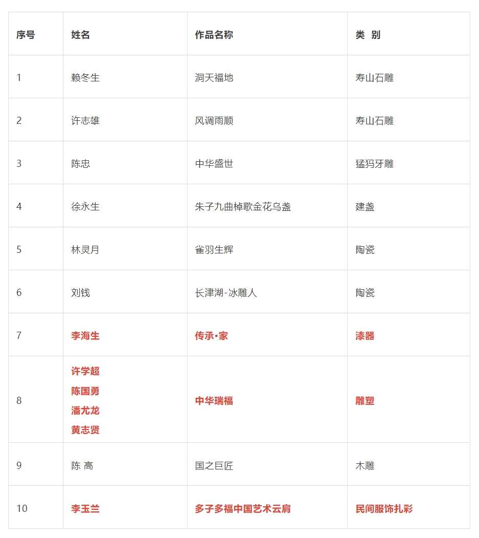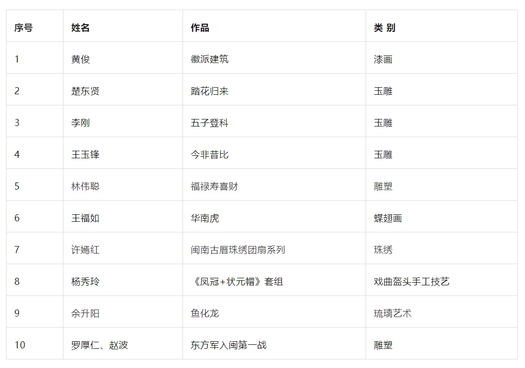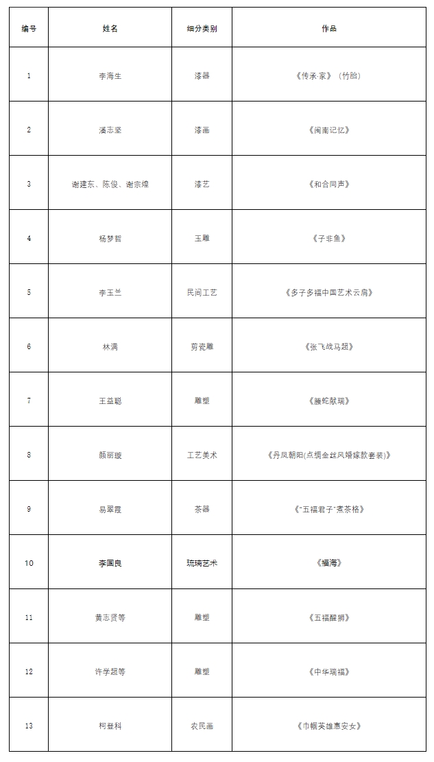 “第三届福建省民间文艺山茶花奖·优秀民间工艺美术作品”终评10件(组)入选作品(金奖)