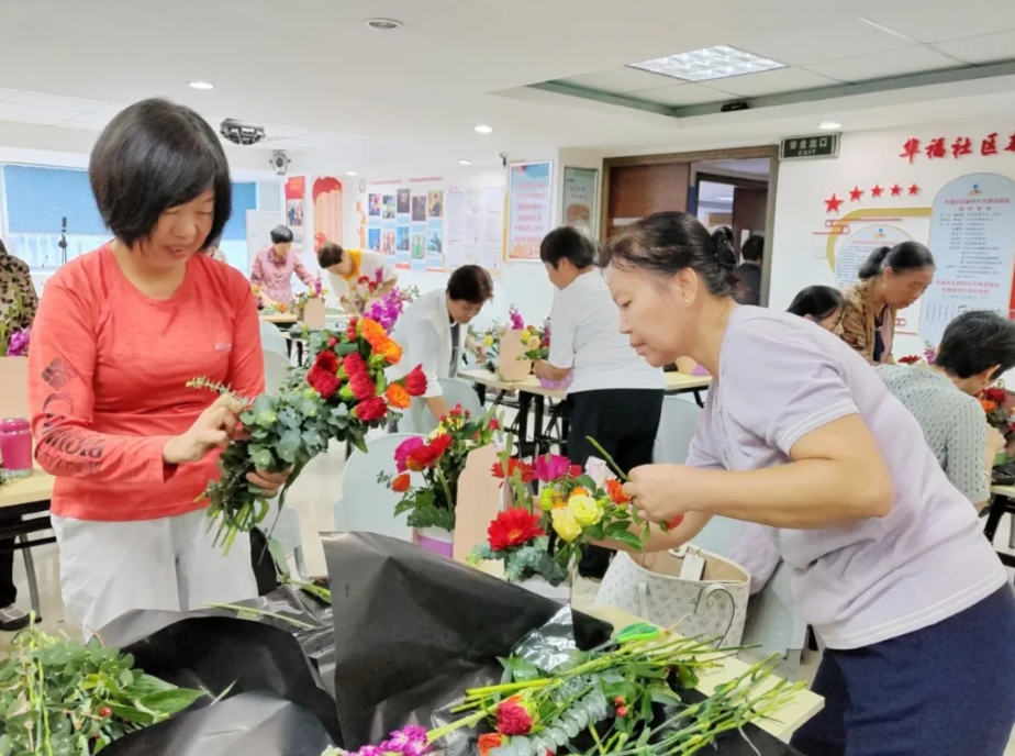陈纯丁深入浅出地为大家讲解了西式插花的历史渊源、选材技巧、插花方法以及后续的养护知识,引领大家进入了一个色彩斑斓、香气四溢的花艺世界,让大家在插花过程中感受了艺术的魅力。在实践环节,陈纯丁耐心指导,一个个美丽的小花篮在居民们的手中诞生。