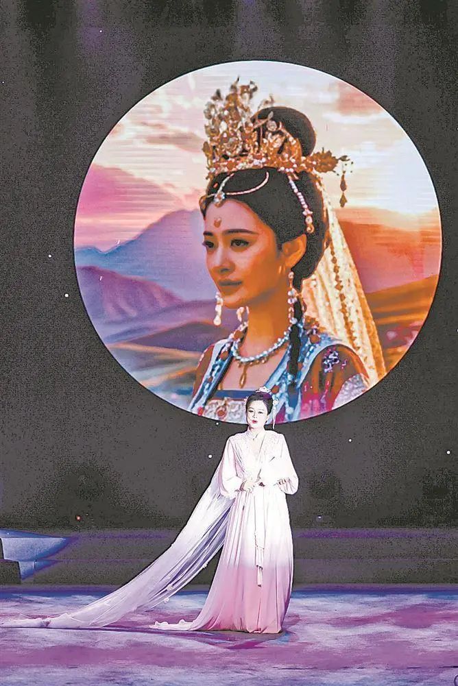 第一篇章“古韵悠长”,邱义娟精选《锦瑟》《青玉案·元夕》《女儿情》《葬花吟》等四首颇具古意的歌曲,以民族唱法演绎,咬字圆润自然,字清韵正,即使不看字幕,也能清晰听懂歌词。篇章中的歌曲雅俗共赏,前两首诗词气象万千,带着深厚的文学底蕴,后两首出自86版《西游记》与87版《红楼梦》,耳熟能详,似邻家碧玉。典雅的舞台,粉色花瓣翩飞,浅吟低唱的玉人儿,拖着长纱迤逦前行,发髻轻拢,珠花垂坠,手上的漆扇是仙气飘飘的仕女图。伴舞的红衣少女,频转娴熟,点地翻身,忽而广袖轻舒,情绪外放,动人地表达出女儿国国王的恋君难舍。大学生的和声纯如天籁,配合《葬花吟》,起到了很好的烘托作用。配乐中西合璧,毫无违和感——钢琴与洞箫跨界融合,颇具雅意;琵琶的加入,相映成趣。