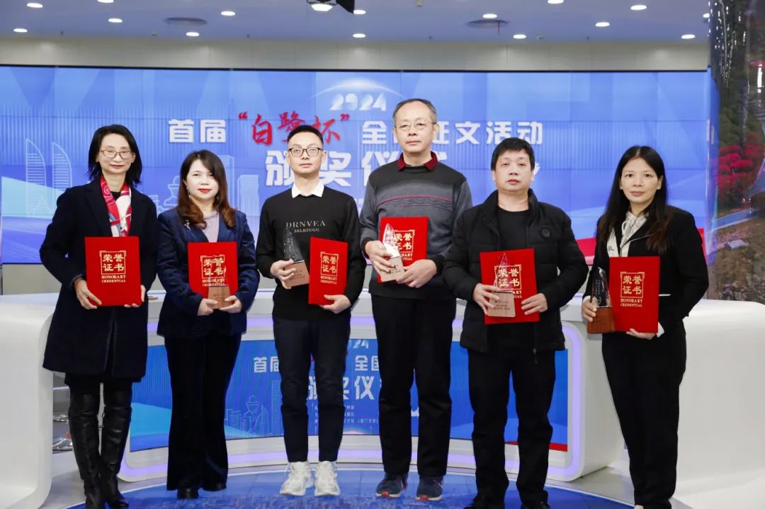 厦门市委宣传部副部长卢寿荣、厦门日报社总编辑许若鲲、厦门市文联副主席陈春洋与三位评委代表——在厦全国著名作家杨少衡、陈慧瑛、刘岸共同为获奖者颁发获奖证书和奖杯。