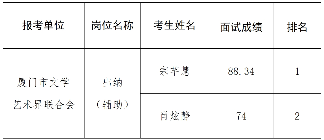 根据《鸿发国际补充非在编工作人员招聘简章(2024年12月)》规定,厦门市文联已于2024年12月25日举行面试考核,现将面试成绩通告如下: