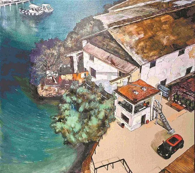 厦门这座城市,在林曦的笔下,被赋予了独特的灵魂。它是时尚与传统的奇妙融合,是潮流气息与深厚底蕴的和谐共生。林曦用卡通画的灵动线条,与粗糙麻布、厚重油画机理相融合。在他的画中,有大量留白,裸露出原始的画布底色。传统油画往往比较忌讳画布没有铺满的状态,会给人一种画面未完成之感,但林曦的画面有意留下麻布的底色,使之成为画面中的一个重要元素。裸露的麻布色既可以是洒在地面的阳光,也可以是暮色中的天空,抑或是日照下的海水,完全取决于画面其他部分的衬托。这种做法不仅巧妙地统一了这个系列的基调,更给整个系列作品笼罩上一抹类似泛黄老照片的怀旧之感。除此之外,林曦的每一张画都有意控制饱和色彩的数量,尽量让每个画面都呈现出简洁明快的色彩印象。老城的风景,往往充斥着喧嚣与庞杂,林曦用不厌其烦的线条来塑造城市的形,再用简单明确的色彩做减法,达到一种平衡。这一系列作品的绘画语言,精准地捕捉并展现出厦门既古老又年轻、既喧嚣又宁静的独特神韵。他笔下的老建筑、老街巷,仿佛都有了生命,诉说着往昔故事,又展现着现代活力。