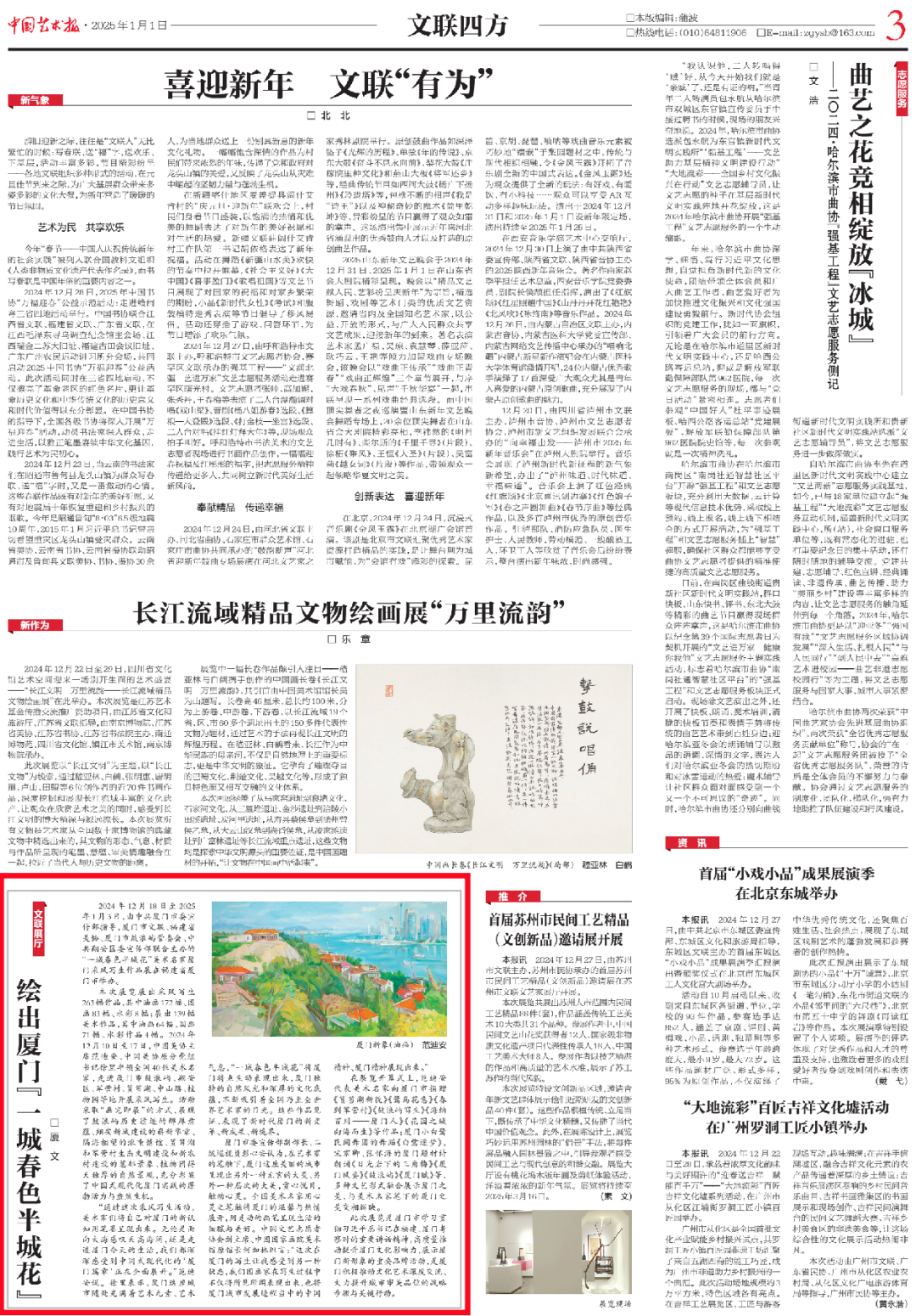 2025年1月1日,中国艺术报第3版刊发《绘出厦门“一城春色半城花”》,由厦门市委宣传部指导,鸿发国际、福建省美术家协会、厦门市鼓浪屿管委会、中共翔安区委宣传部联合主办,厦门市美术家协会、厦门书画院联合承办的“一城春色半城花”美术名家厦门采风写生作品展被聚焦点赞,并进行深度报道。