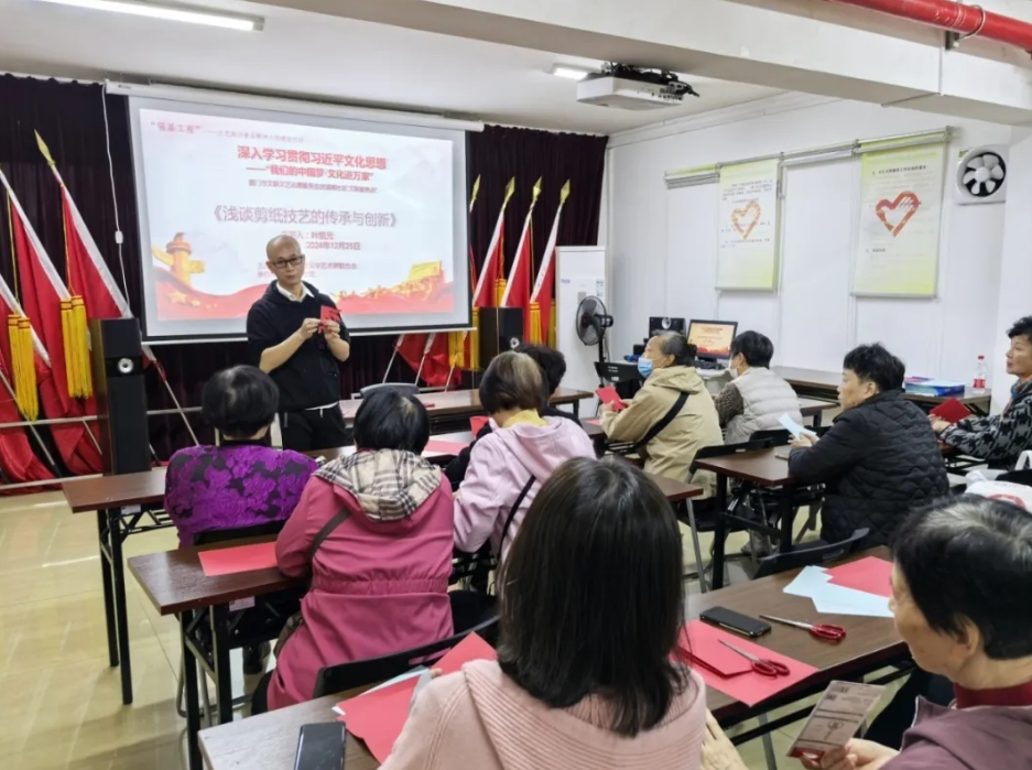 叶凯元深入讲解了剪纸艺术的历史渊源后,向居民详细介绍了剪纸的概念、方法和技巧,让大家初步了解剪纸的艺术内涵及相关理论技巧。实践环节中,居民们跟着叶凯元,将纸张变成活灵活现、栩栩如生的剪纸作品,通过亲手制作,居民们近距离地感受到了中华优秀传统文化的温度与深度。