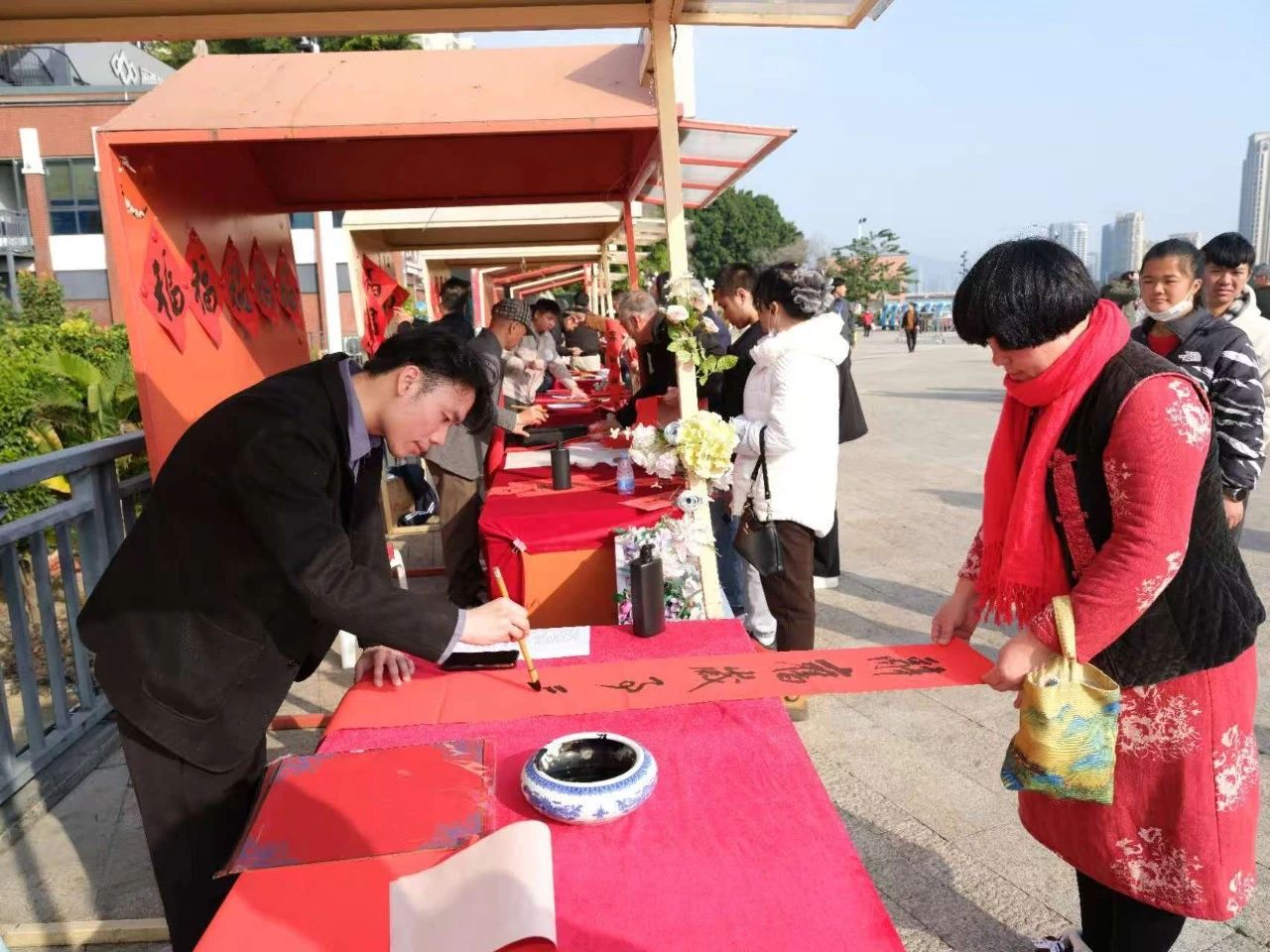 在现场,中国摄影家协会副主席、省文联副主席、省摄影家协会主席潘朝阳,省书法家协会主席李木教,国家级非物质文化遗产项目浦城剪纸技艺国家级传承人周冬梅等文艺大咖领衔优秀文艺志愿者团队,现场为福州市民拍摄“全家福”、书写春联、剪纸送福,让优质文艺资源以人民喜闻乐见的方式直达基层,为人民群众送上新年新春的美好祝福!