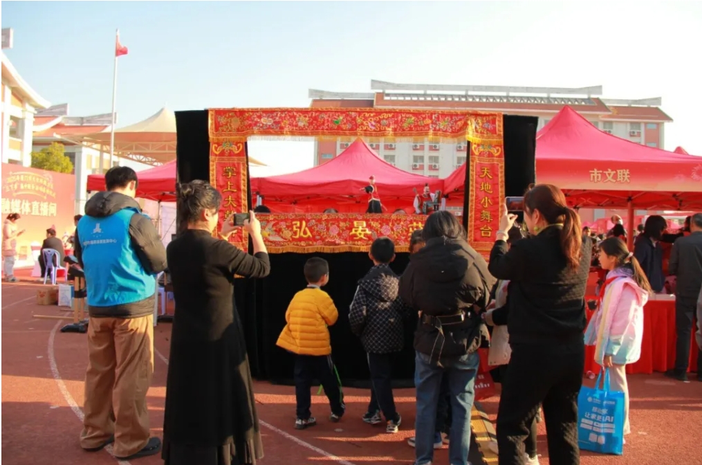 弘晏庄木偶皮影戏传习中心在现场为大家带来布袋木偶戏表演。不少观众被精彩表演吸引驻足观看、拿起手机拍照、录像,记录精彩瞬间。