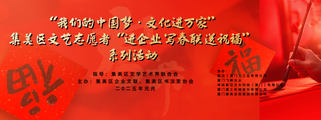 活动相关人员表示,此次系列活动还将组织集美区的文艺志愿者们走进厦门飞鹏企业、咪咕新空科技、厦工机械股份、集美发展集团等企业,推动优质文艺资源直达基层,面向基层职工群众书写、赠送春联和“福”字等书法作品,丰富广大群众的精神文化生活,营造欢乐祥和的节日氛围,为传承弘扬中华优秀传统文化,助力“福文化”建设贡献文艺力量。