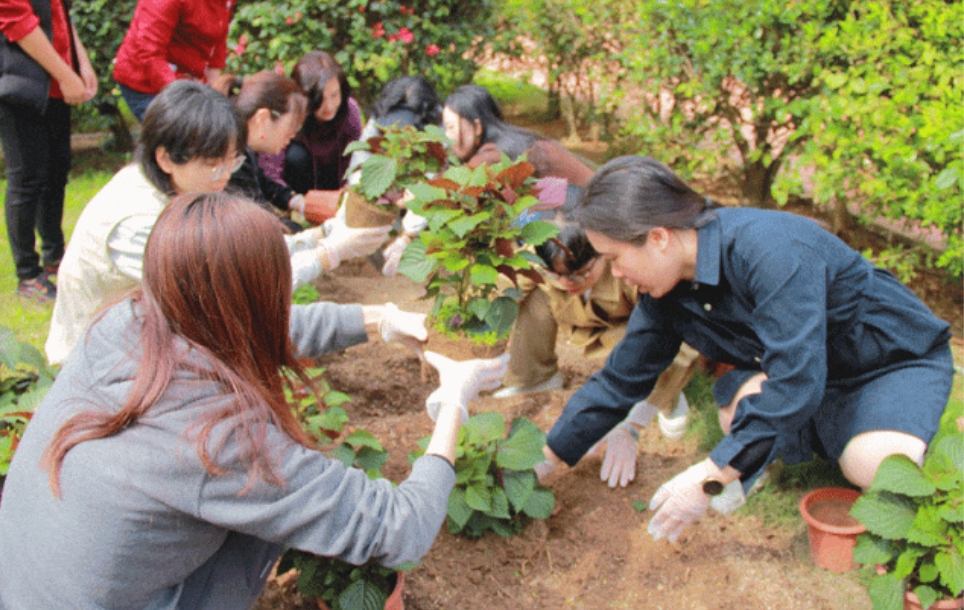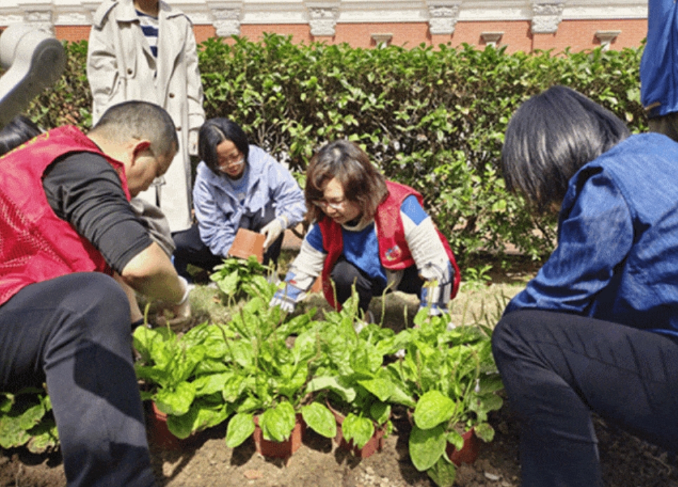 干部职工们热情高涨,现场呈现出一派热火朝天的劳动景象。在划定的种植区域内,大家分工明确,有的沿着塑料盆外侧,仔细避开根系,剪开塑料盆,取出绿植;有的拿起小铲子,认真地在土地上挖坑,翻松泥土;还有的负责栽种,小心翼翼地将绿植放入挖好的坑中,扶正、培土。各个环节衔接有序,配合默契,现场不时传来交流声和欢笑声。